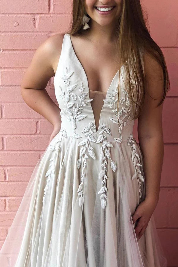 A-Line Appliqued V-neck Satin and Tulle Ivory Bridal Gown Wedding Dress,MW353