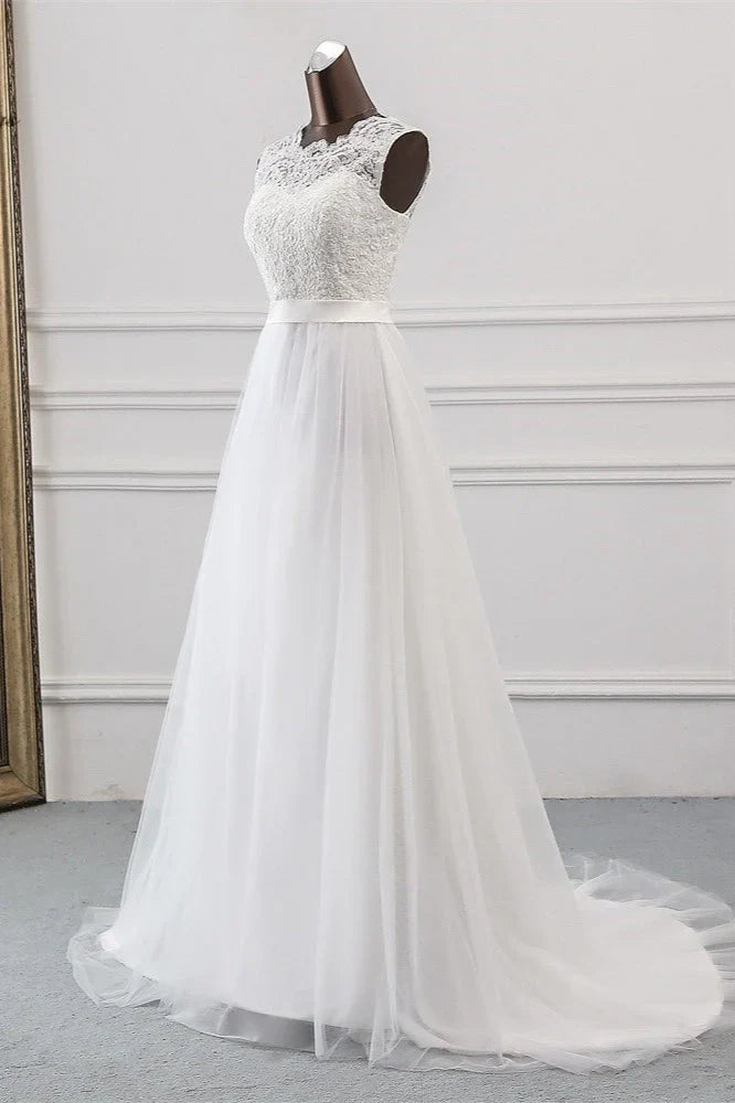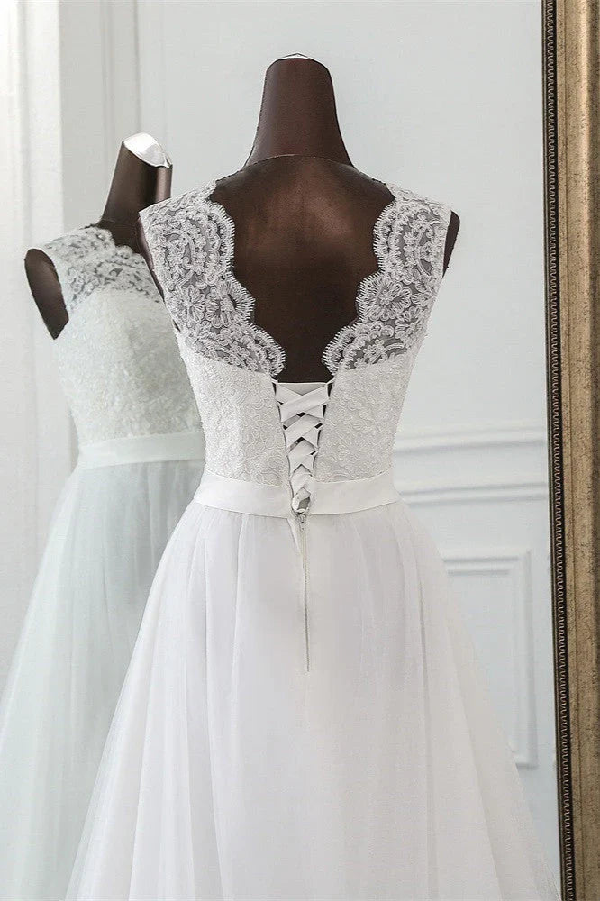 A-line Elegant Long Jewel Tulle Appliques Lace Wedding Dress