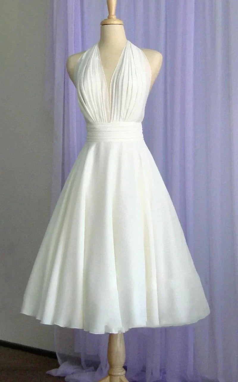 A-line Halter Neck Vintage Tea-Length Chiffon Wedding Dress