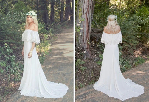 A-line Off the Shoulder Bohemian Lace Chiffon Ivory Summer Beach Wedding Dresses.MW344