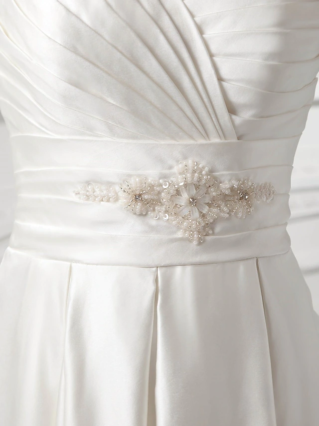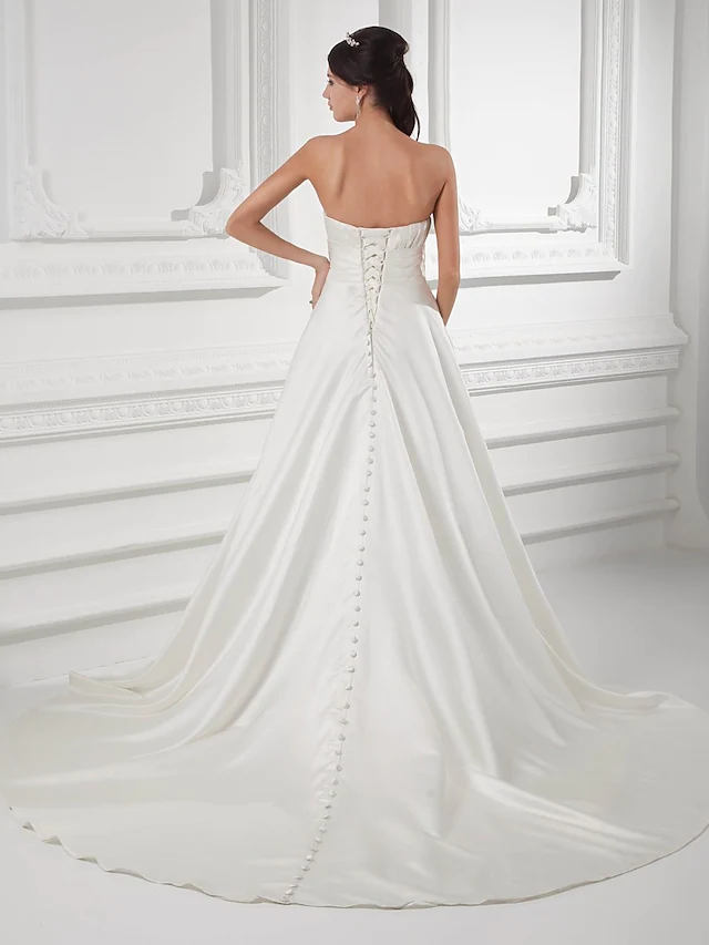 A-Line Wedding Dresses Sweetheart Neckline Court Train Satin Strapless with Buttons Ruched Beading