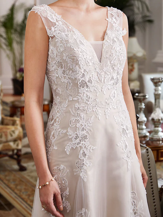 A-Line Wedding Dresses V Neck Court Train Lace Tulle Regular Straps Romantic Illusion Detail with Beading Appliques
