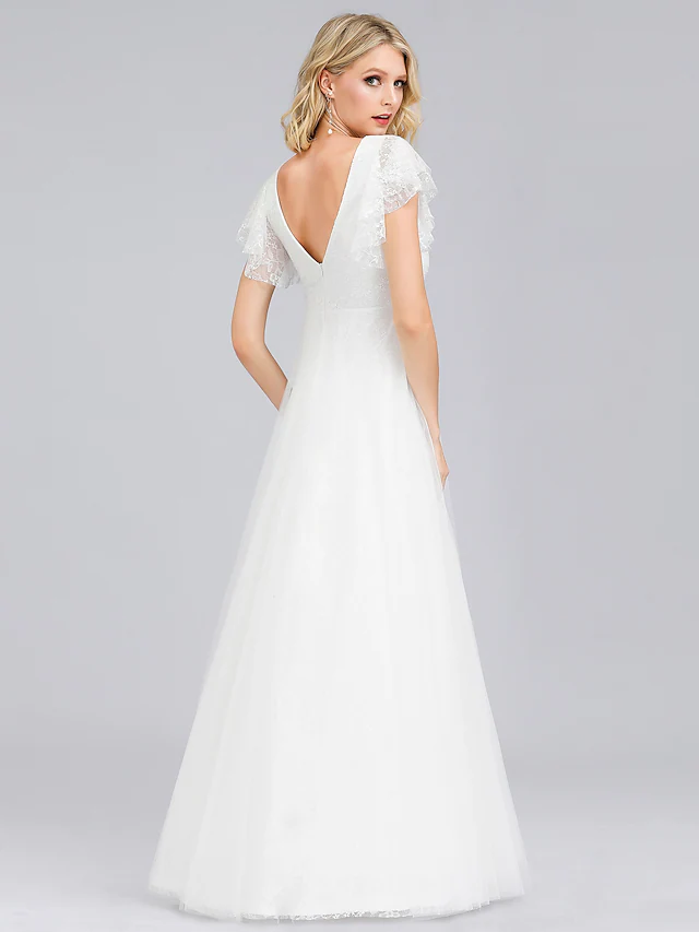 A-Line Wedding Dresses V Neck Floor Length Lace Short Sleeve Simple Casual Boho Illusion Detail Backless with Lace