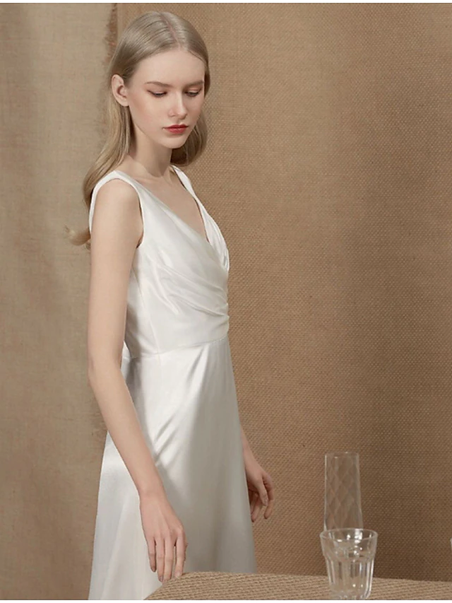 A-Line Wedding Dresses V Neck Charmeuse Sleeveless Simple Vintage with Ruched