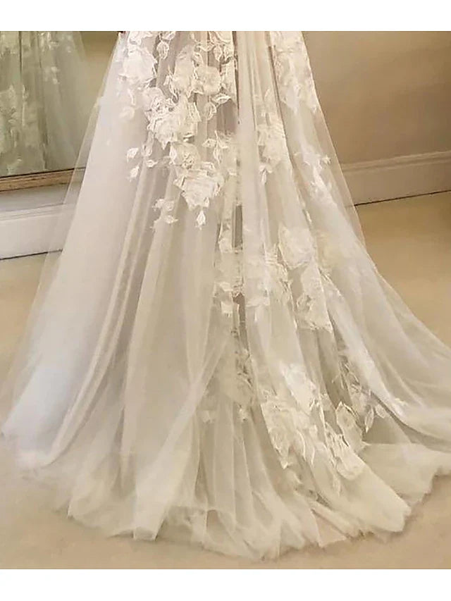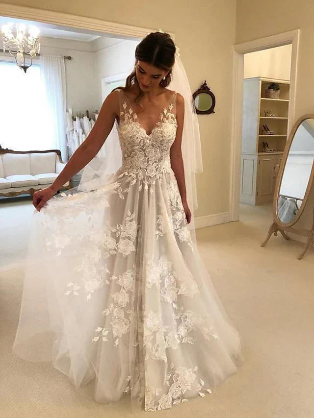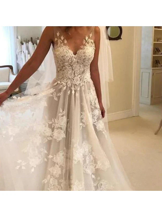 Beach Boho Wedding Dresses Sweep / Brush Train A-Line Sleeveless V Neck Lace With Appliques