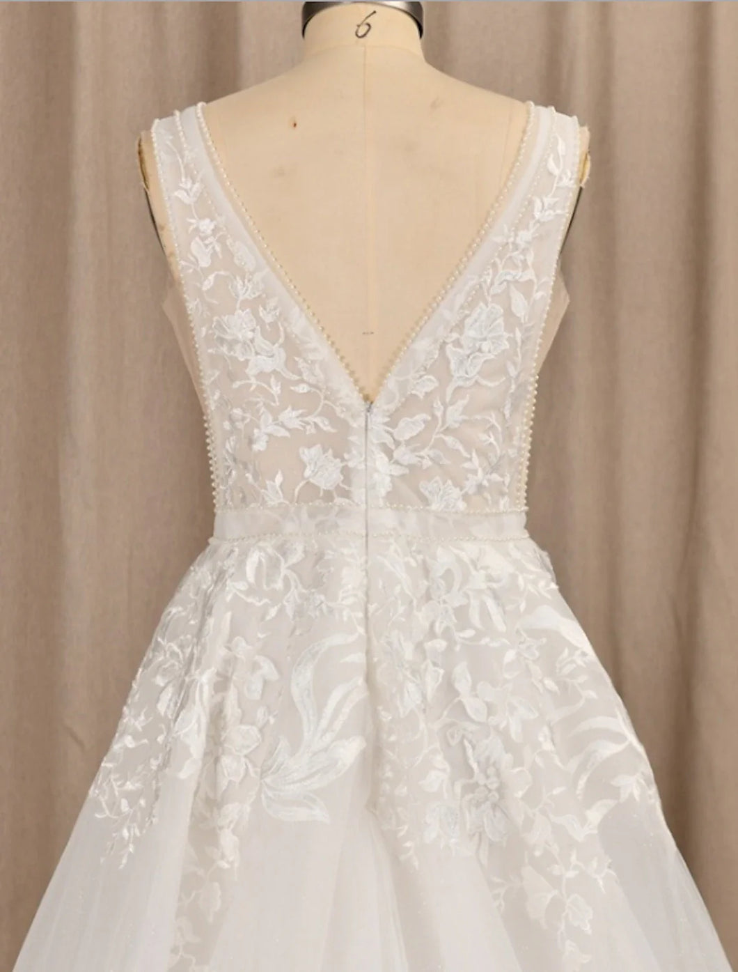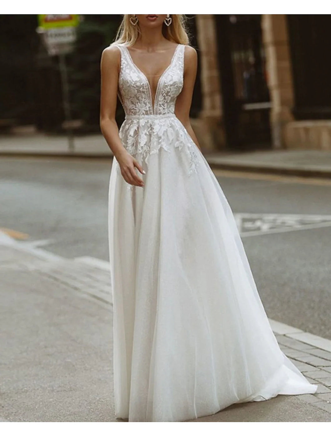 Beach Wedding Dresses A-Line V Neck Sleeveless Sweep / Brush Train Lace Bridal Gowns With Appliques