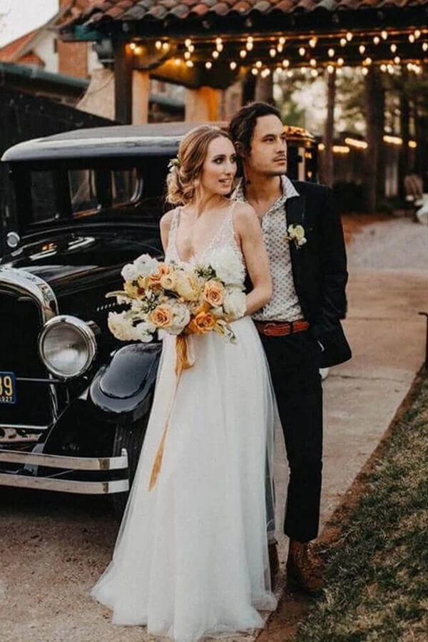 Cheap Tulle A-line V-neck Backless Sweep Train Wedding Dress with Pearls.MW429
