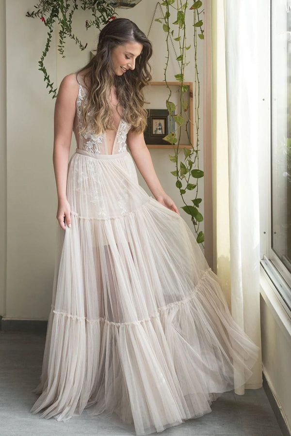 Embroidery A-Line Appliques V-neck Bohemain Tulle Wedding Dress.MW441
