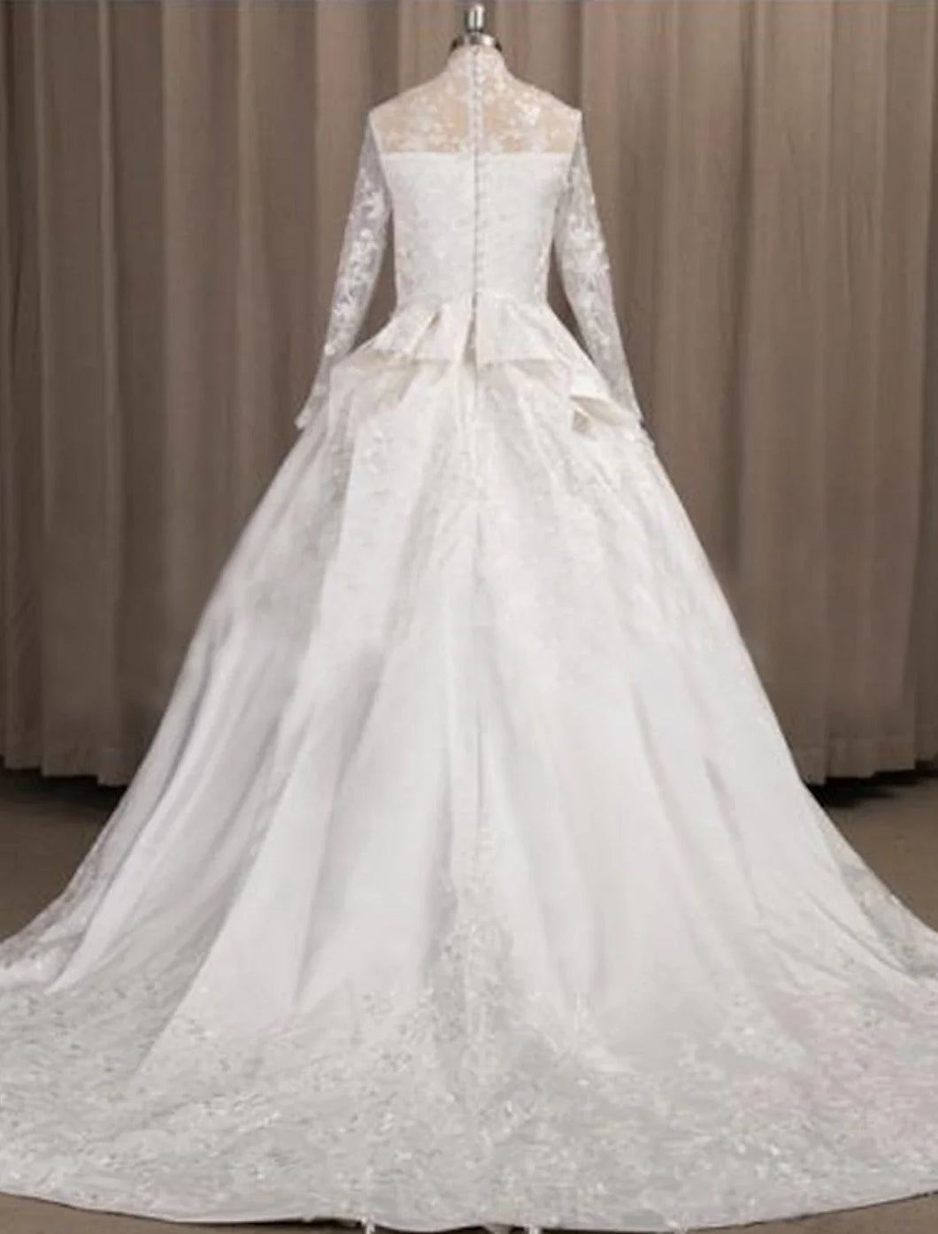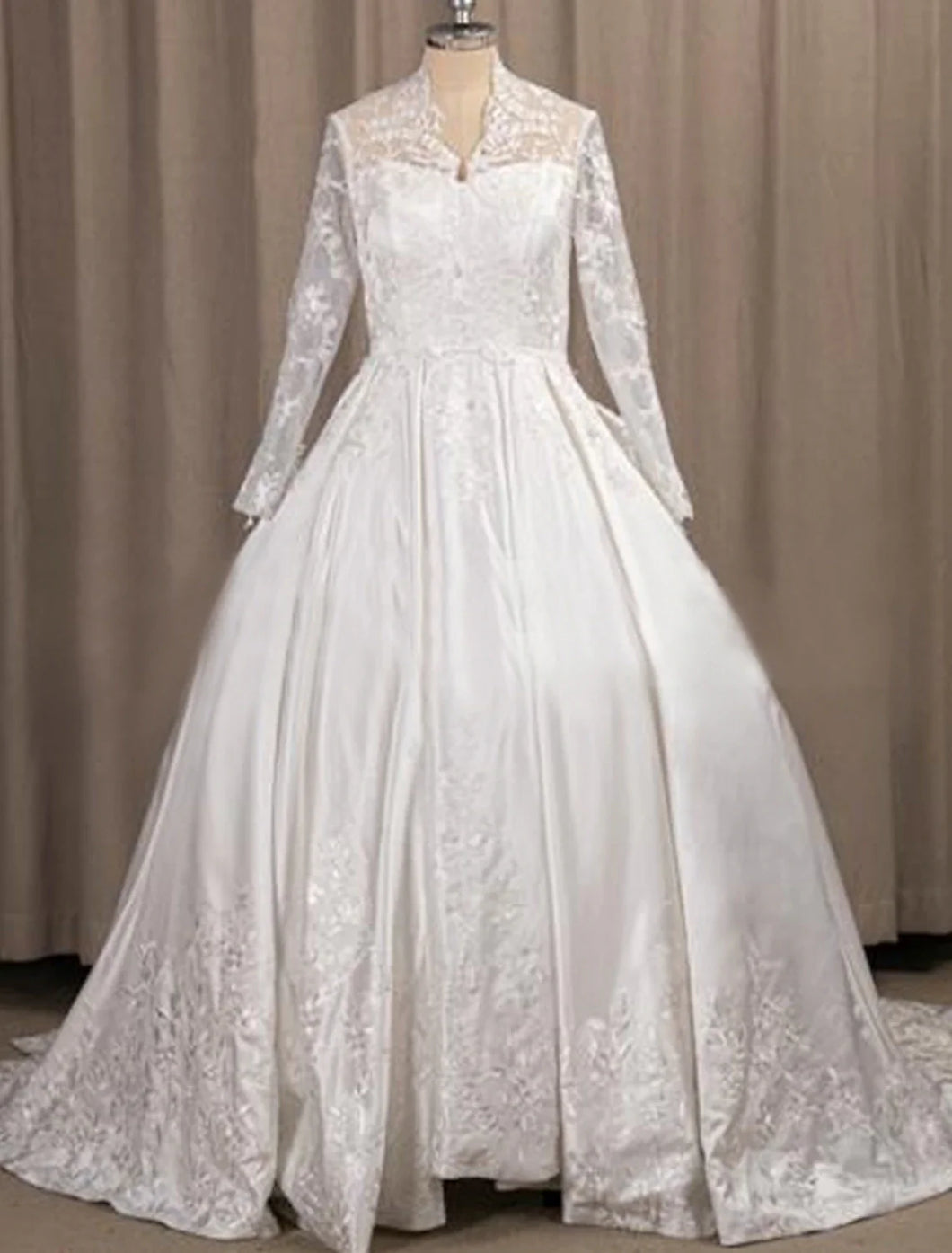 Engagement Formal Wedding Dresses A-Line Illusion Neck Long Sleeve Court Train Satin Bridal Gowns With Pleats Appliques