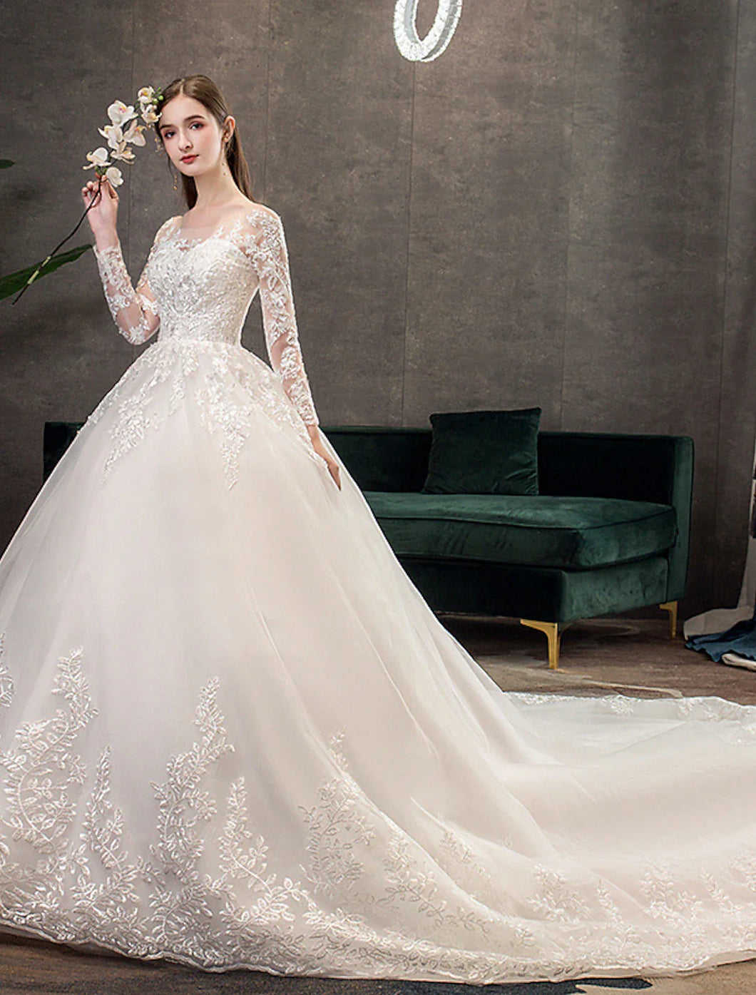 Engagement Formal Wedding Dresses Ball Gown Illusion Neck Long Sleeve Cathedral Train Lace Bridal Gowns With Pleats Appliques