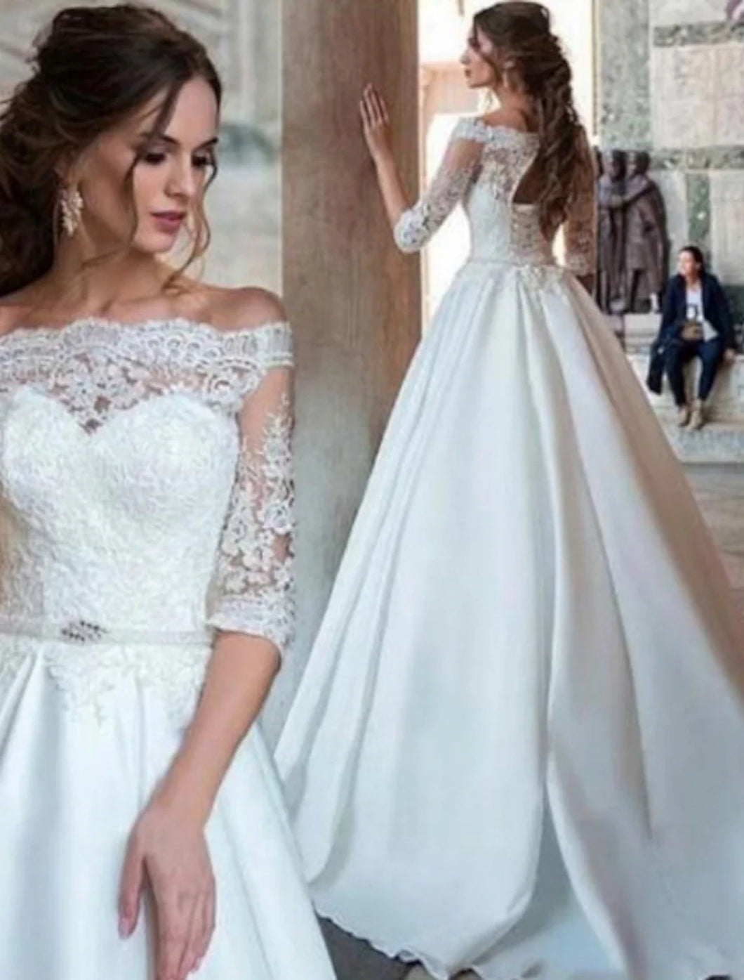 Engagement Formal Wedding Dresses Ball Gown Off Shoulder Half Sleeve Sweep / Brush Train Satin Bridal Gowns With Pleats Appliques