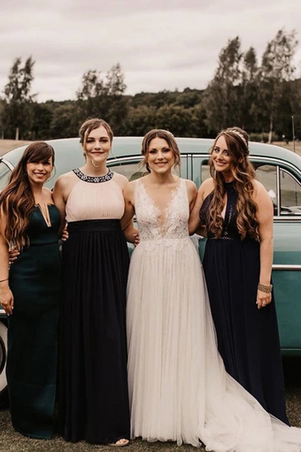 Graceful Ivory Beaded Deep V Illusion A-Line Wedding Gown Lace Wedding Dress,MW365