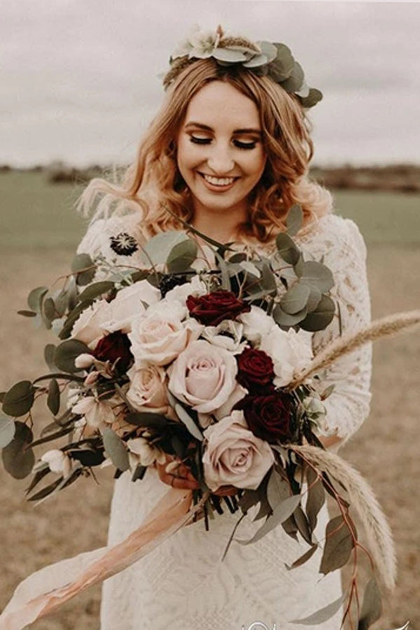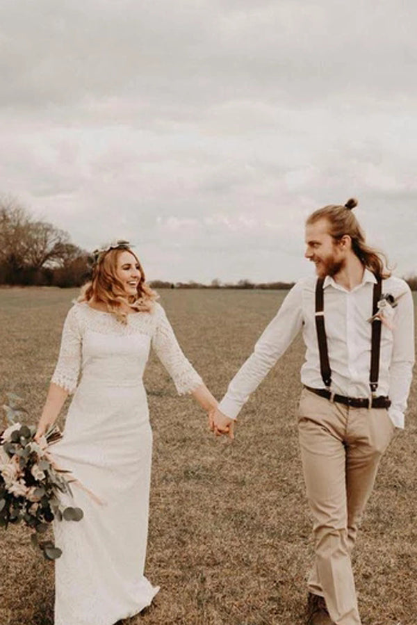 Ivory A-line Lace Bateau Neck 3/4 Sleeves Bridal Dresses Floor-length Wedding Dresses.MW374