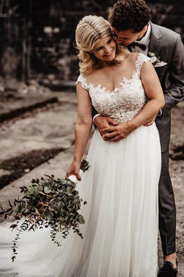 Ivory Tulle A-line Illusion Neck Wedding Dresses with Lace Appliques. MW573