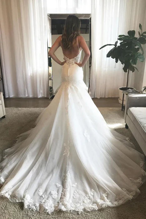 Mermaid V-neck Open Back Spaghetti Straps Lace Wedding Dresses with Train