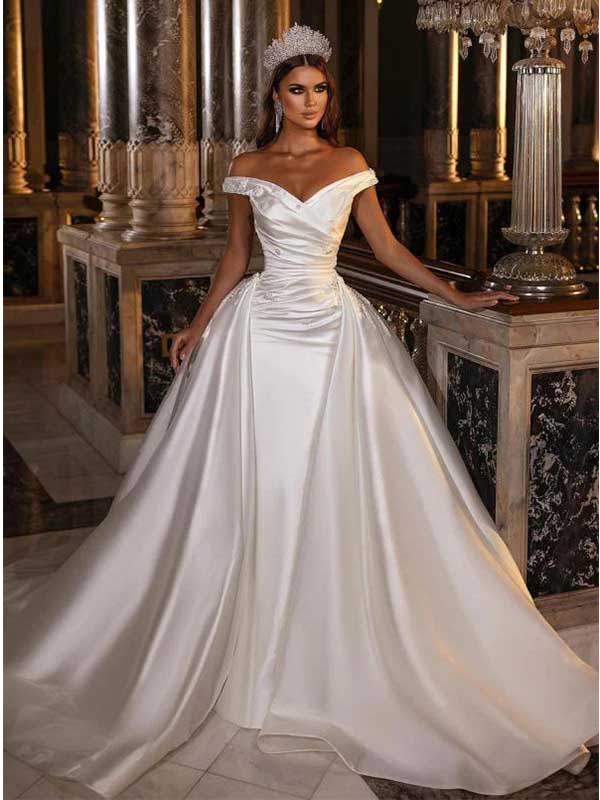 Off Shoulder Satin A-line Wedding Dress with Pleats, WD0487