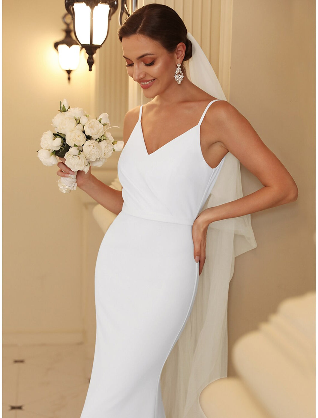 Reception Casual Wedding Dresses Mermaid / Trumpet Camisole V Neck Spaghetti Strap Sweep / Brush Train Stretch Fabric Bridal Gowns With Ruched Draping