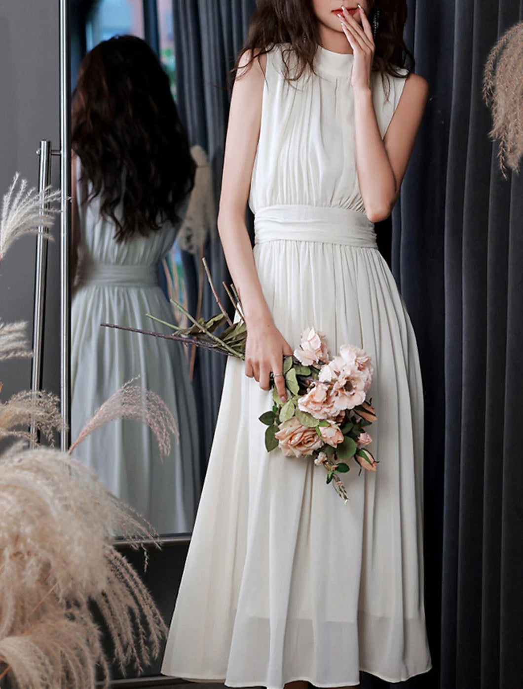 Reception Little White Dresses Wedding Dresses A-Line High Neck Sleeveless Tea Length Chiffon Bridal Gowns With Pleats Solid Color