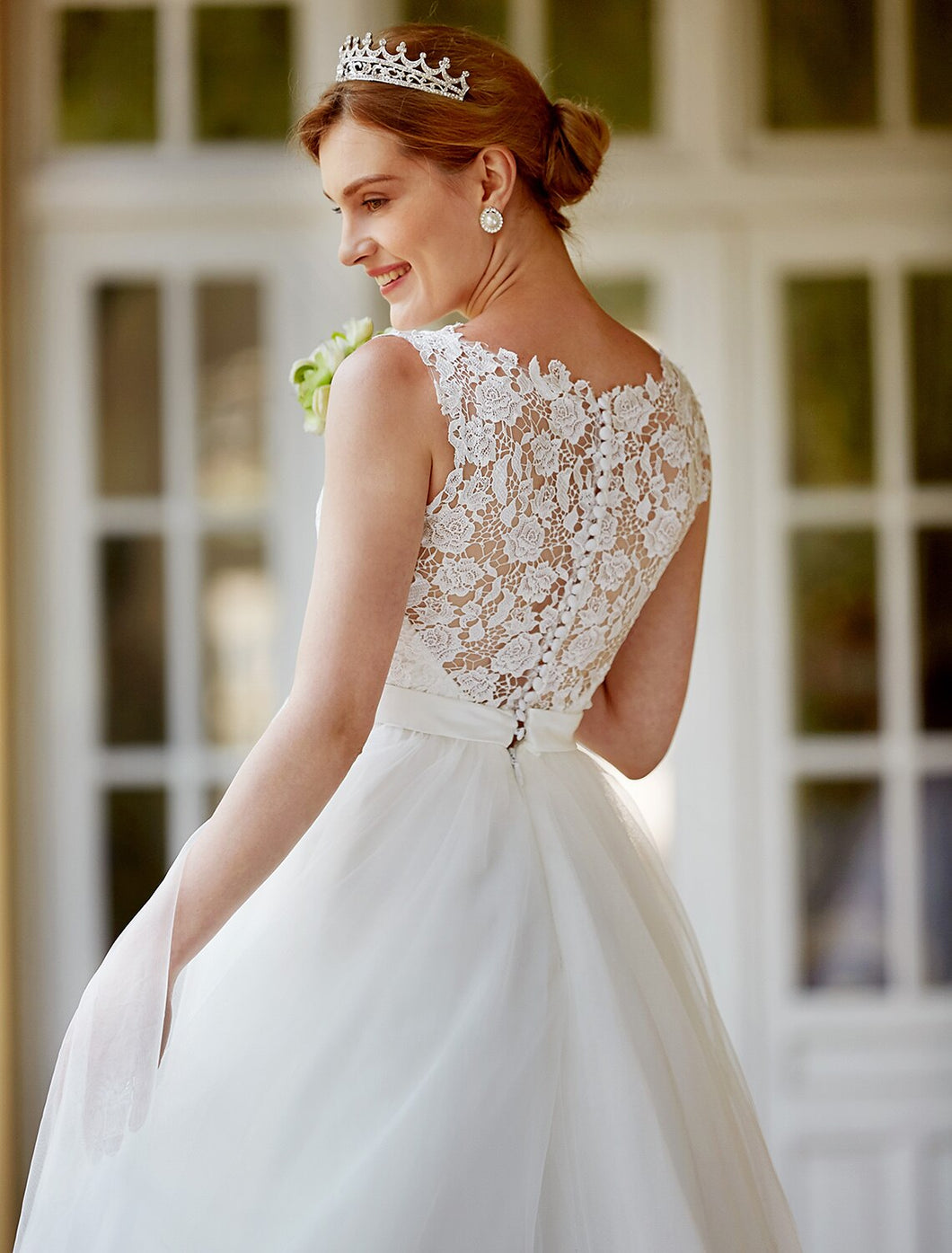 Reception Little White Dresses Wedding Dresses A-Line Illusion Neck Sleeveless Tea Length Lace Bridal Gowns With Sashes / Ribbons Buttons