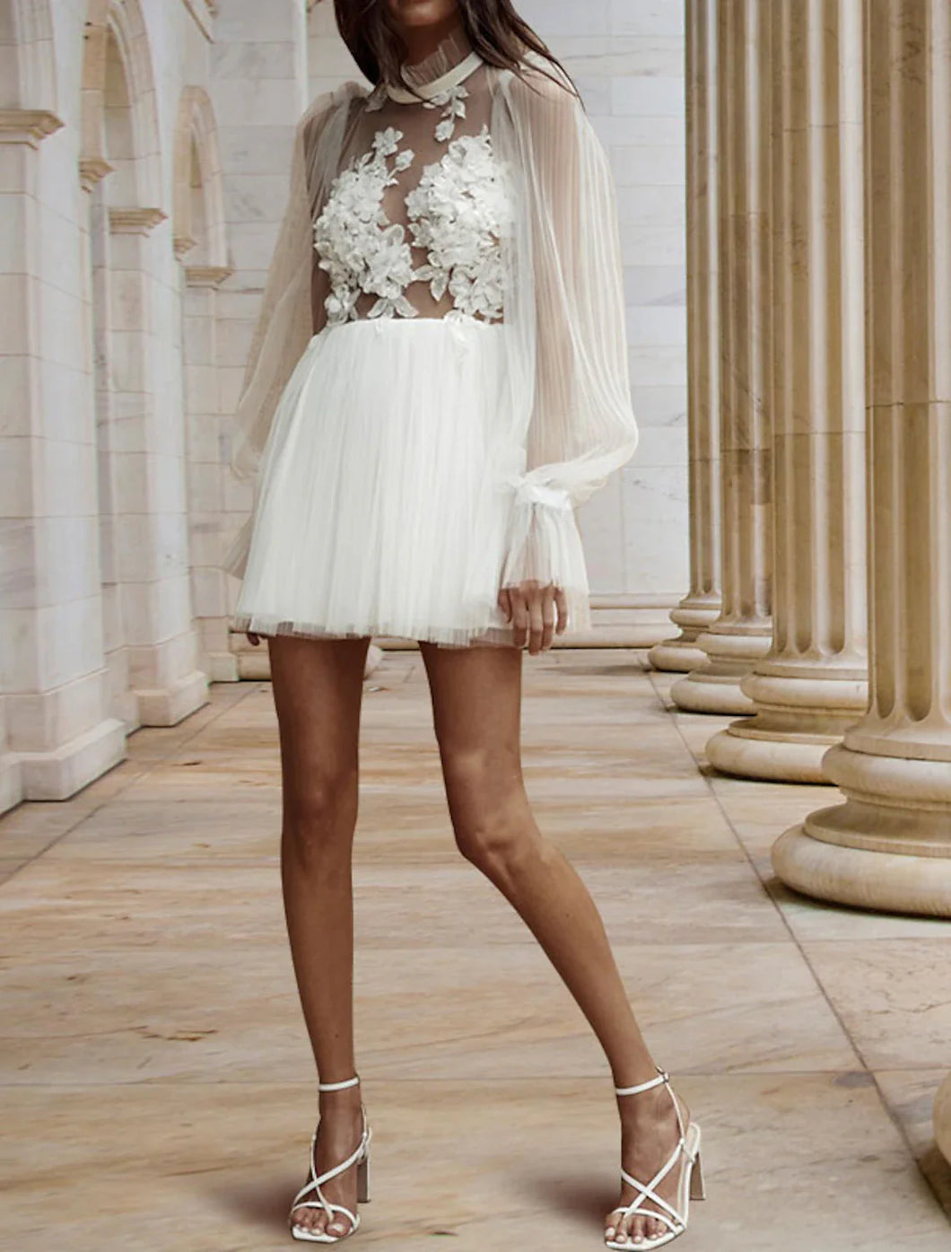 Reception Open Back Little White Dresses Wedding Dresses A-Line High Neck Long Sleeve Short / Mini Satin Bridal Gowns With Pleats Appliques