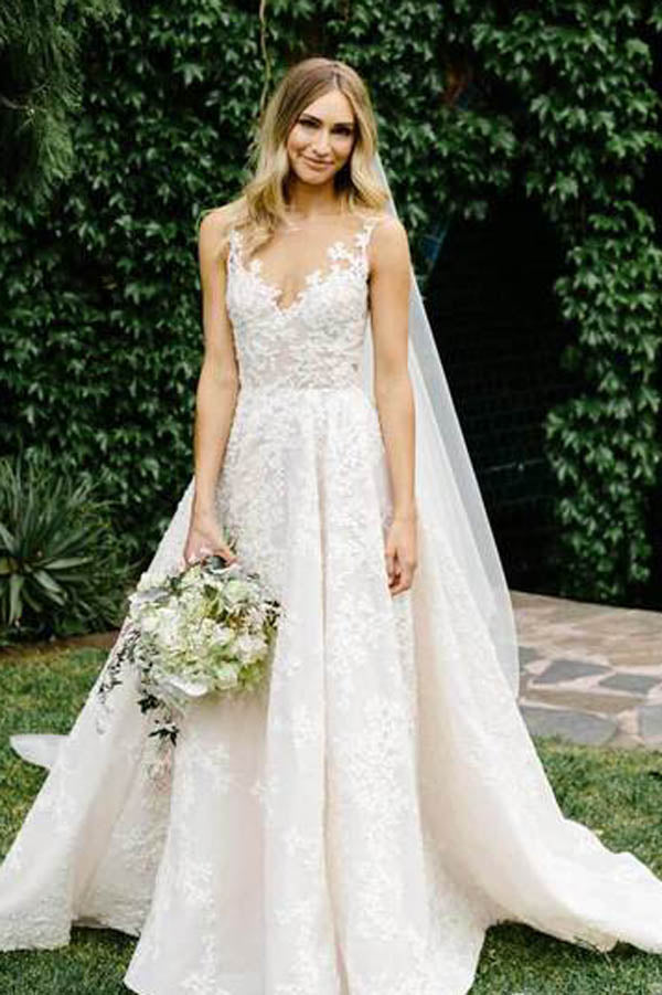 See Through Vintage Lace Illusion Neck Wedding Gowns.MW278.