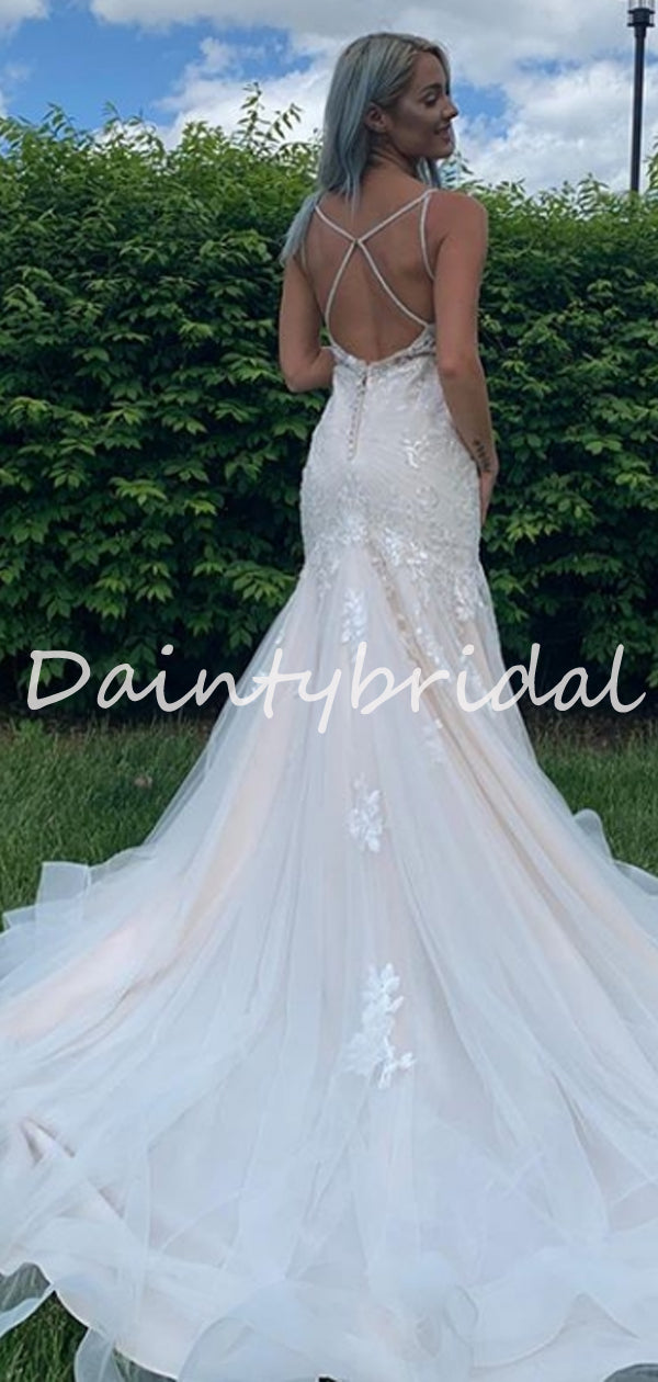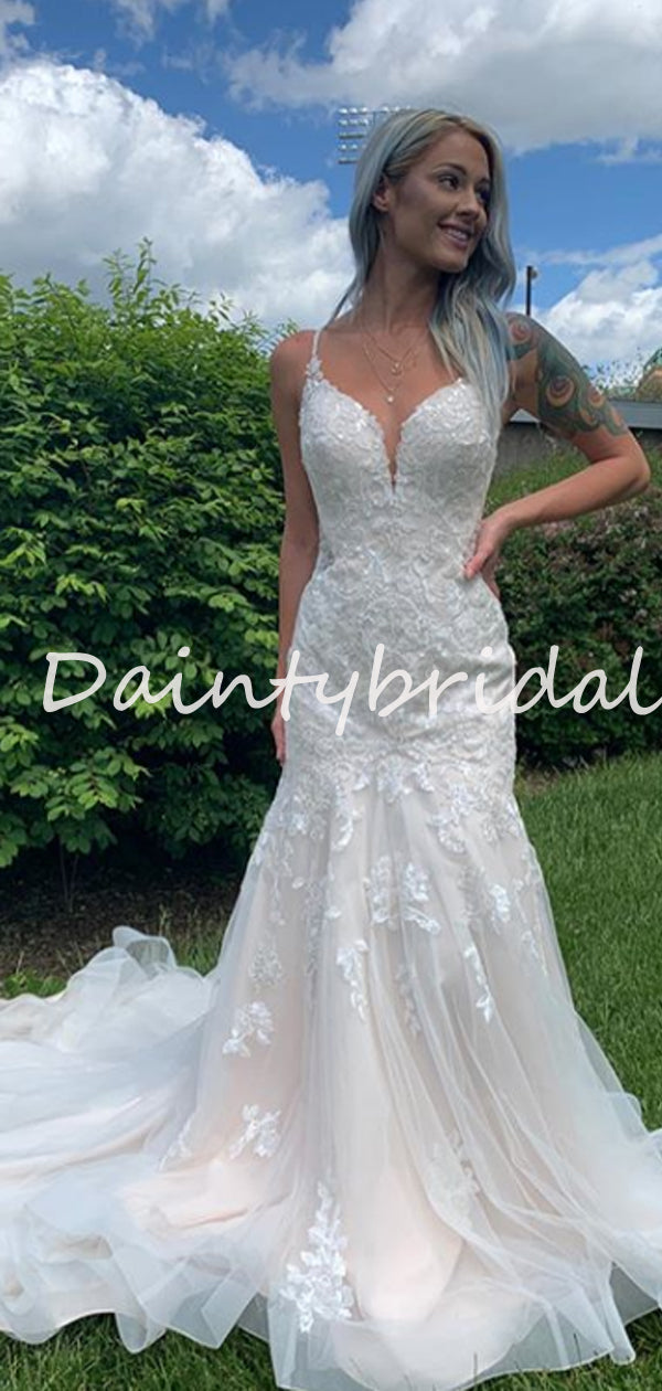 Simple Sexy Spaghetti Strap V-neck Mermaid Lace Tulle Long Wedding Dresses Evening Dresses.