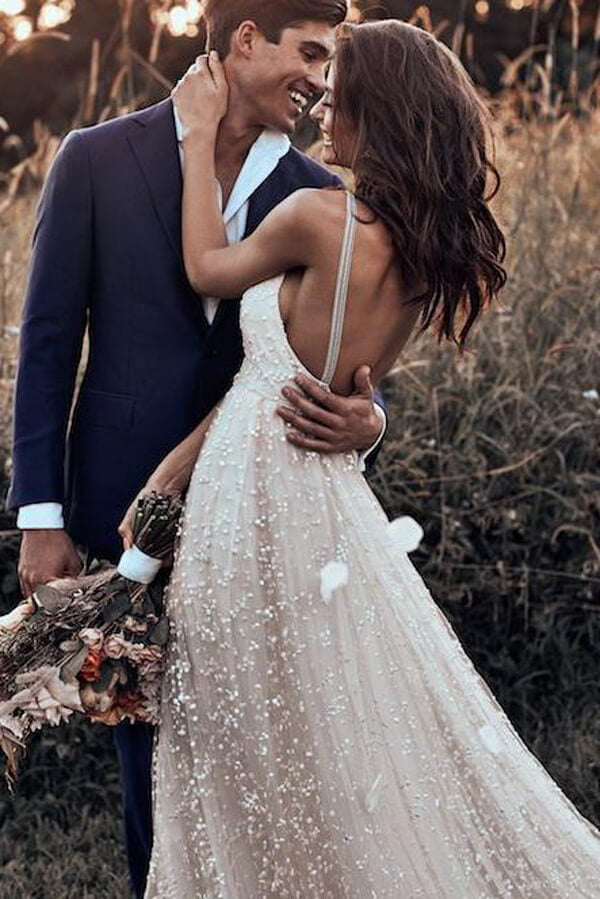 Simple Tulle A-line V-neck Backless Spaghetti Starps Wedding Dresses. MW568