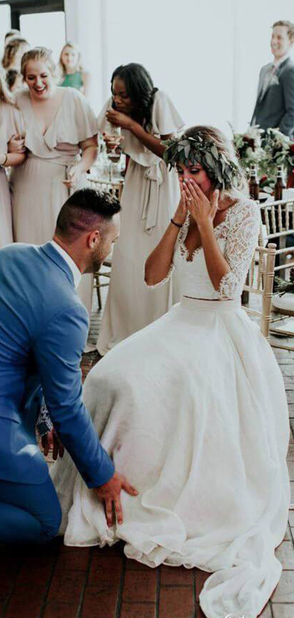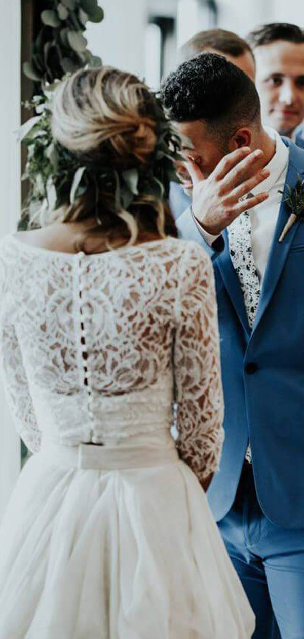 Simple V-neck Lace Chiffon 3/4Sleeves Long Two-piece Wedding Dresses.
