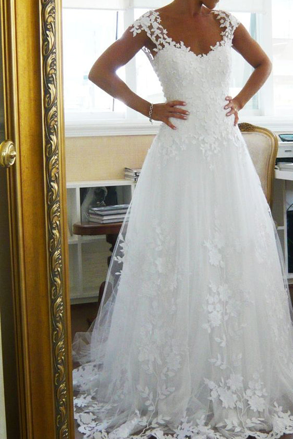 Simple Wedding Dresses V-neck A-line Brush Train White Lace Bridal Gown,MW433