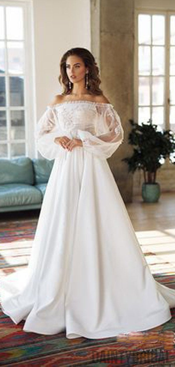 Straight Neck Satin With Lace A-line Long Wedding Dresses.