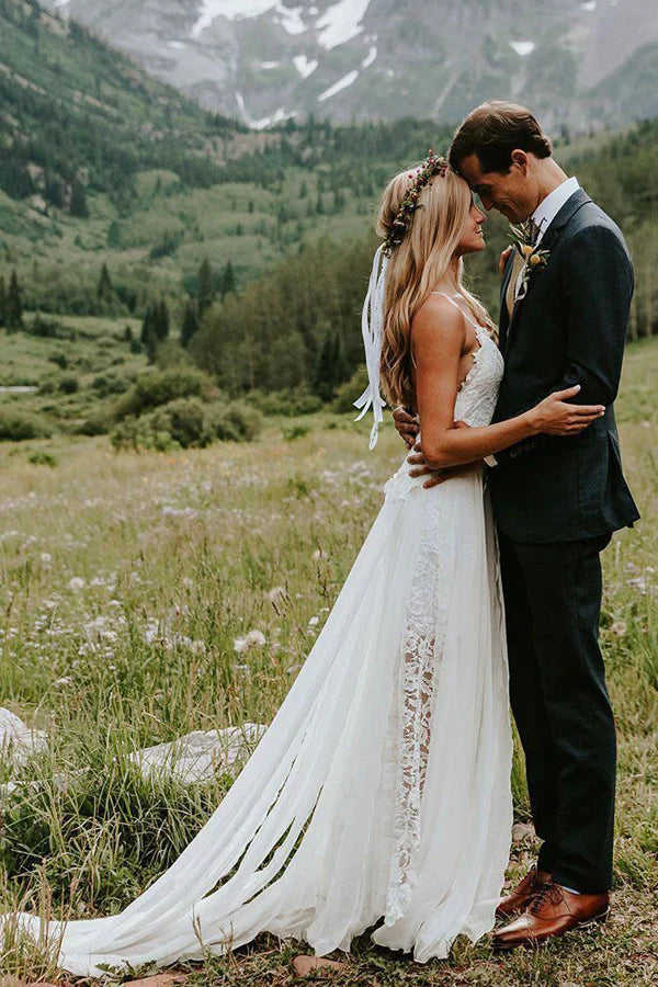 Sweetheart Chiffon Spaghetti Strap Lace Beach Wedding Dresses
