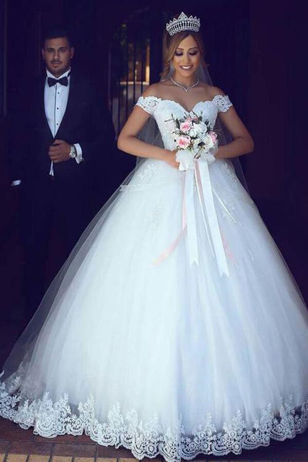 Tulle Ball Gown Off Shoulder Appliqued Wedding Dresses With Sweep Train, MW566