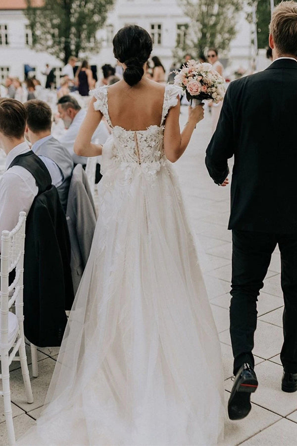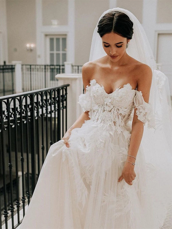 Tulle Off the shoulder A-line Sweep Train Wedding Dresses With Appliques.MW469