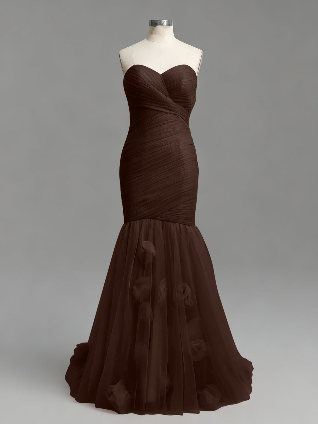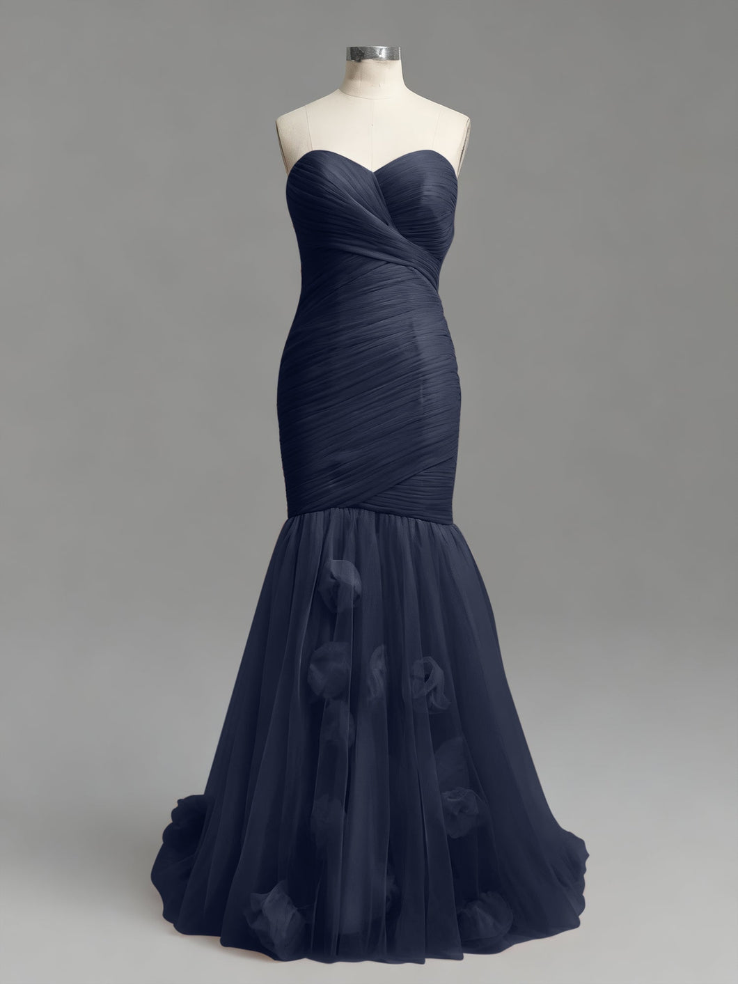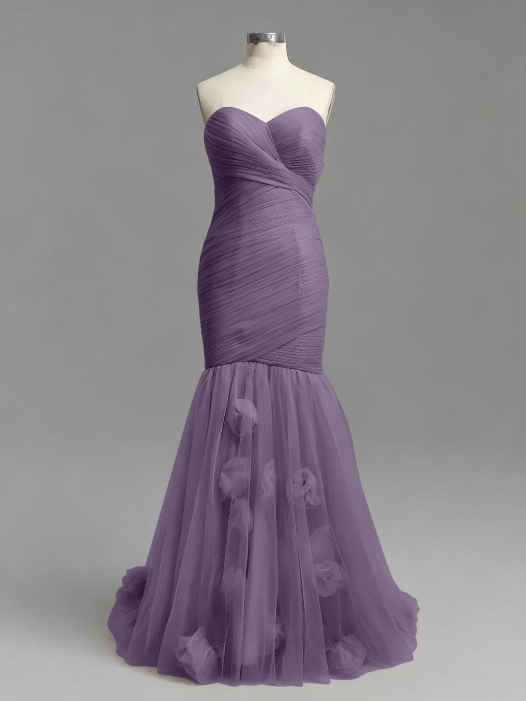 This is pure. high-fashion romance. This stunning dusty rose prom gown is all about texture. featuring a strapless sweetheart neckline and a meticulously ruched tulle bodice. The fabric is asymmetrically wrapped and sculpted to create a perfect. figure-hugging silhouette. At the knee. the dress dramatically flares into a soft. airy tulle mermaid skirt. which is adorned with whimsical. scattered 3D floral appliqués for a final. romantic touch.
