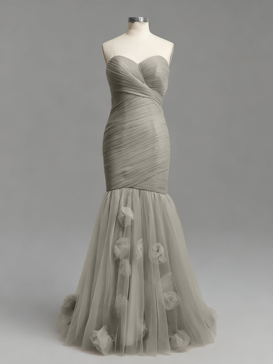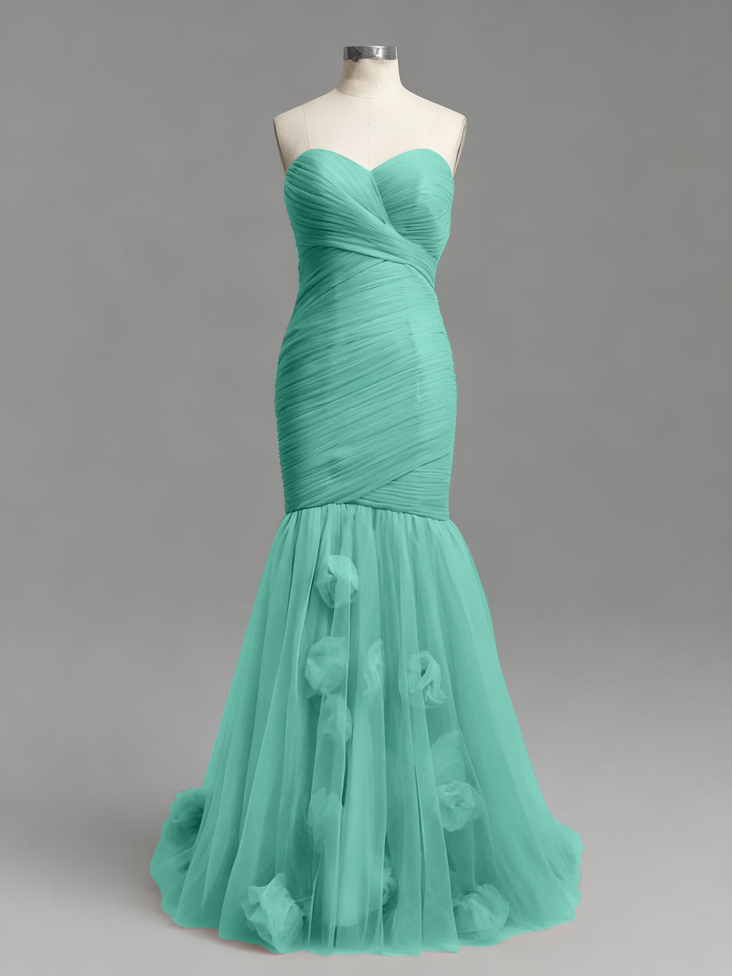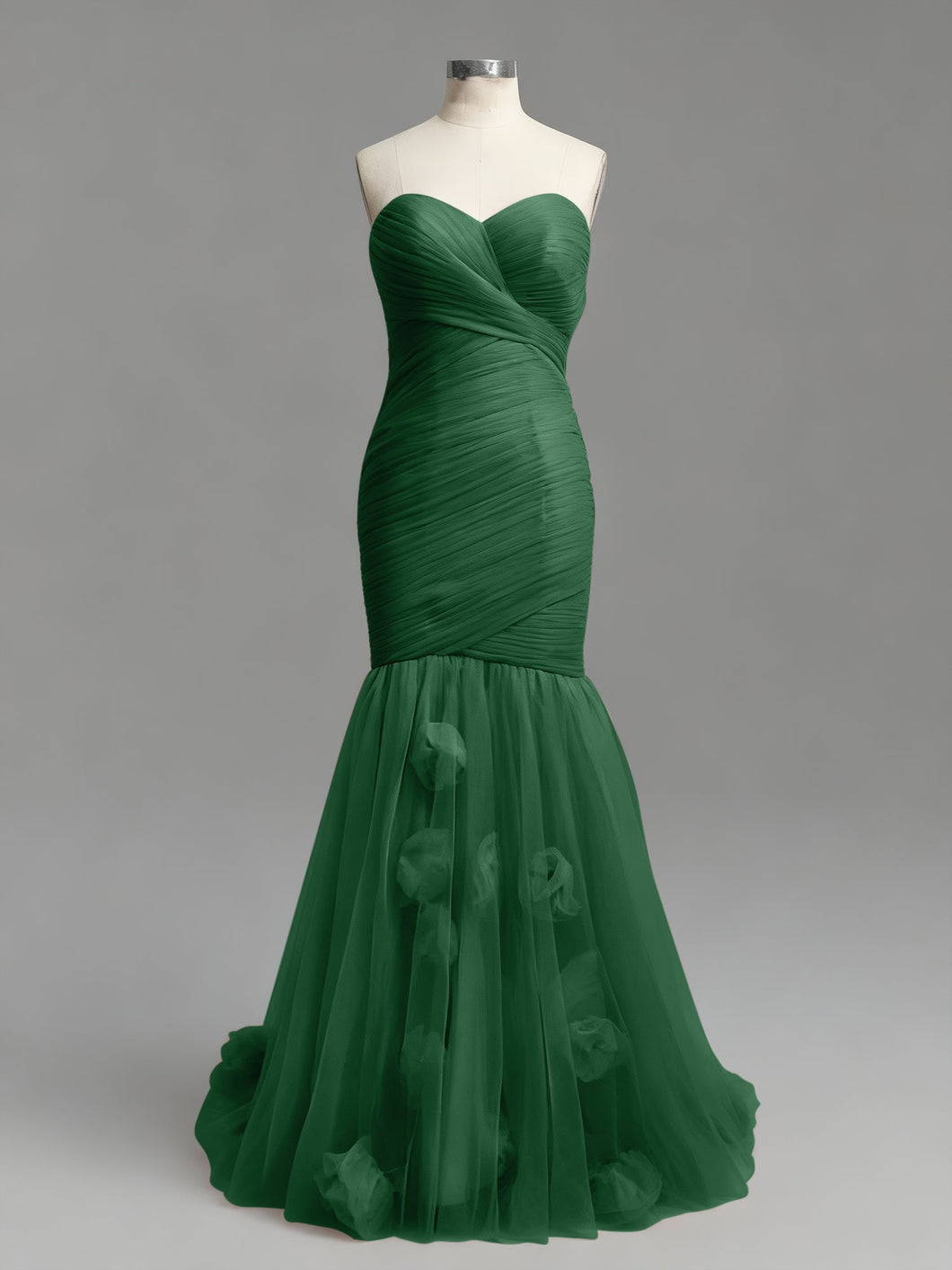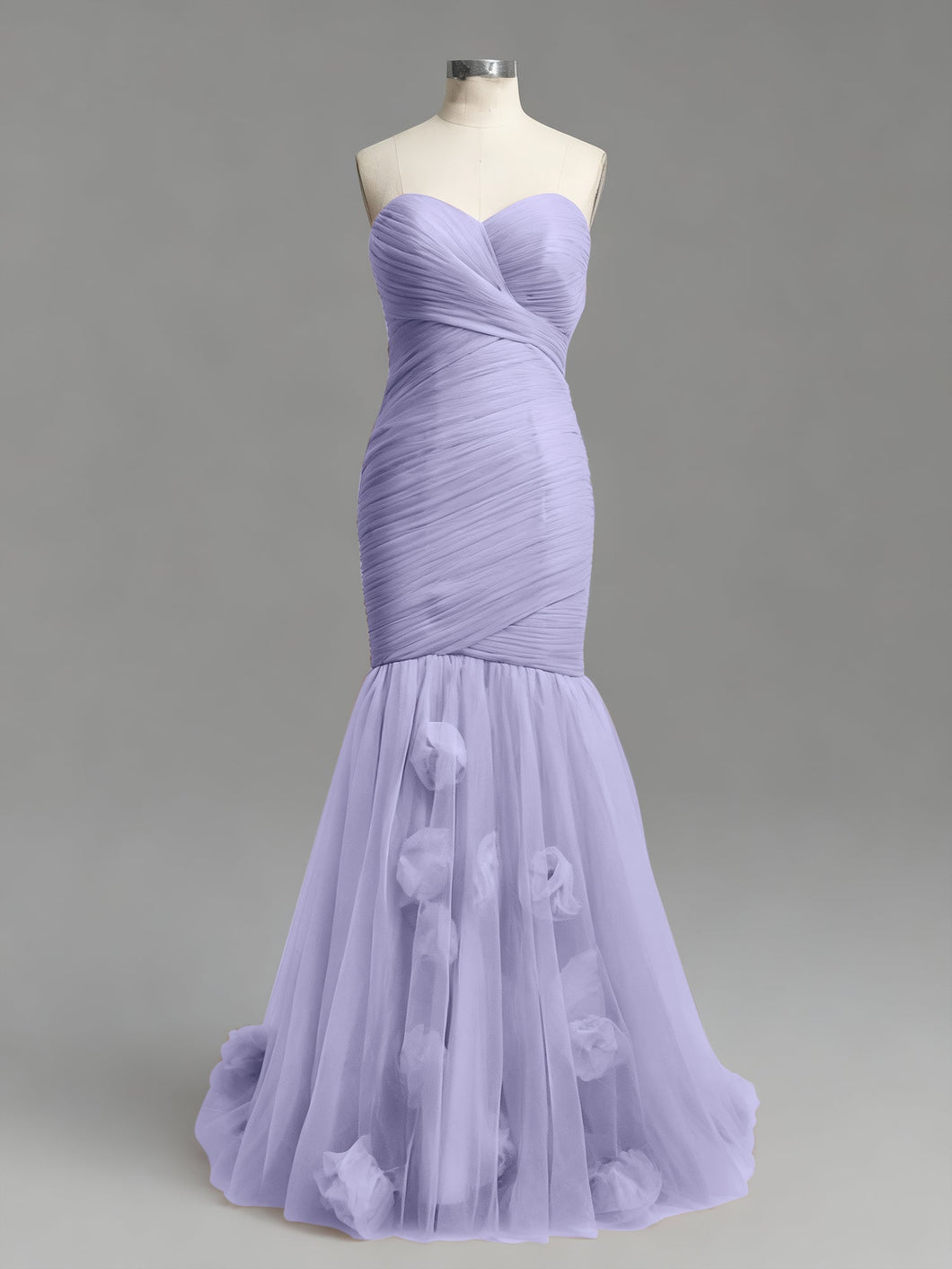 This is pure. high-fashion romance. This stunning dusty rose prom gown is all about texture. featuring a strapless sweetheart neckline and a meticulously ruched tulle bodice. The fabric is asymmetrically wrapped and sculpted to create a perfect. figure-hugging silhouette. At the knee. the dress dramatically flares into a soft. airy tulle mermaid skirt. which is adorned with whimsical. scattered 3D floral appliqués for a final. romantic touch.