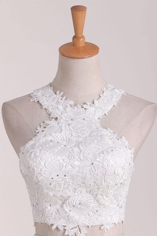 Two-Piece Scoop Homecoming Dresses A Line Satin With Applique  PD411