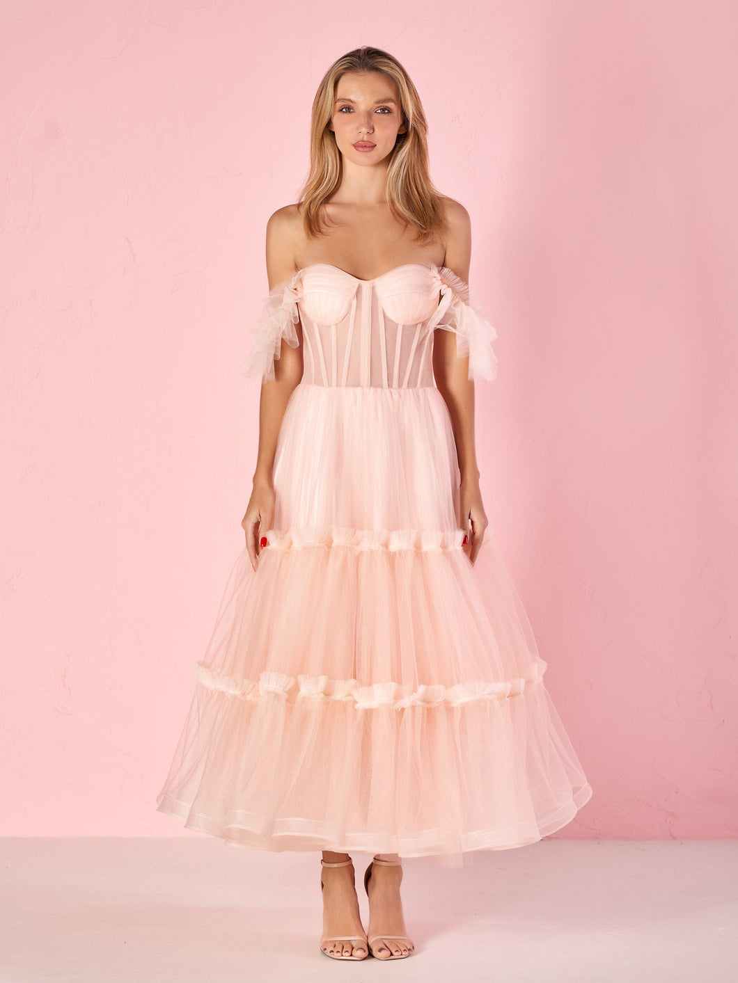 Introducing Katalina. a symbol of exquisite elegance wrapped in a tea-length. black tulle dress that offers an intimate dance between classic charm and modern sophistication. As you slip into Katalina. the off-the-shoulder and sweetheart neckline gently caresses your silhouette. whispering secrets of timeless beauty and subtle allure. The corset. not merely a structure but a statement. enhances your form with a blend of tradition and contemporary elegance. Your every movement is celebrated by the playful ruffles of the skirt. bringing an enchanting lightness and a youthful spirit to every occasion. A lace-up back assures not just a perfect fit but adds a dash of vintage romance. creating a look that is undeniably alluring. ensuring you're not just seen. but truly remembered.