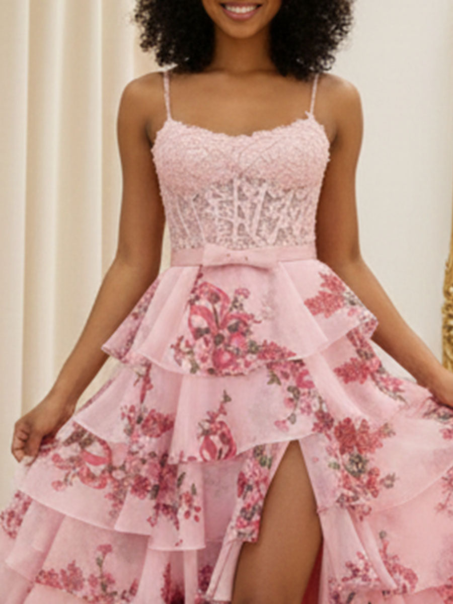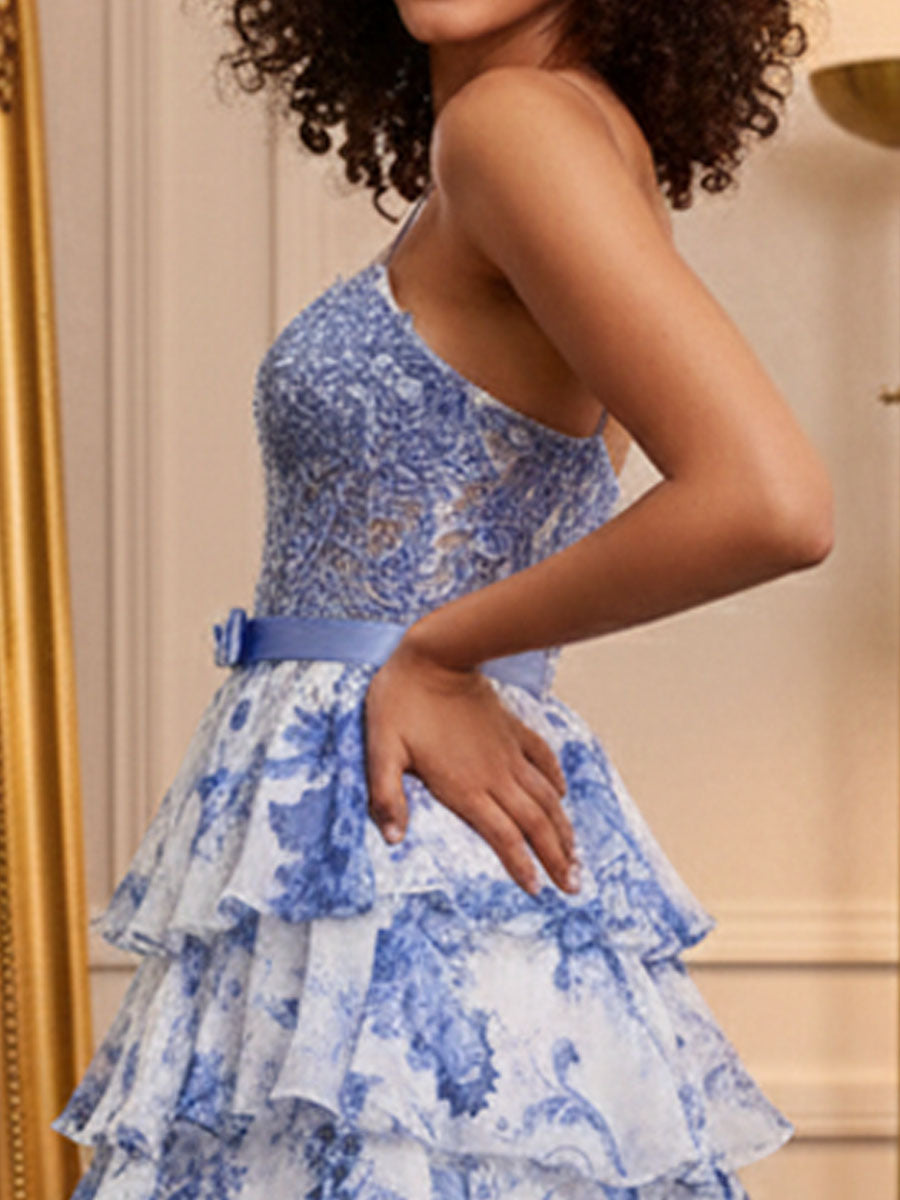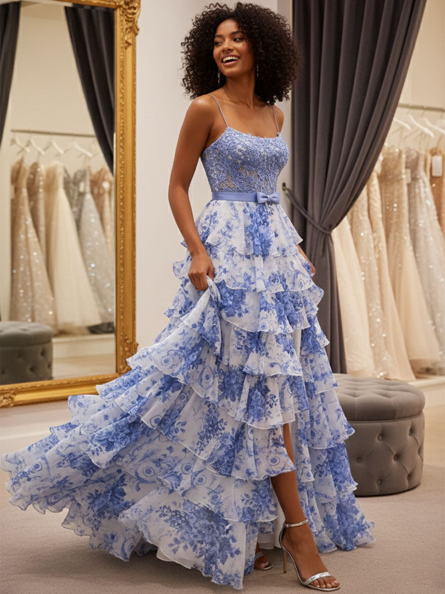 Step into a whimsical garden romance with this enchanting blue and white prom gown. Reminiscent of classic porcelain designs. the dress features a delicate blue floral print on a crisp white background. The bodice is intricately detailed with textured beading or lace that complements the print. supported by dainty spaghetti straps. A sweet satin bow belt defines the waist. leading into a playful high-low skirt composed of cascading tiered ruffles. This waterfall hemline allows you to show off your favorite heels while enjoying the drama of a floor-length train in the back. Perfect for garden parties. tea-length formal events. or a unique prom look.