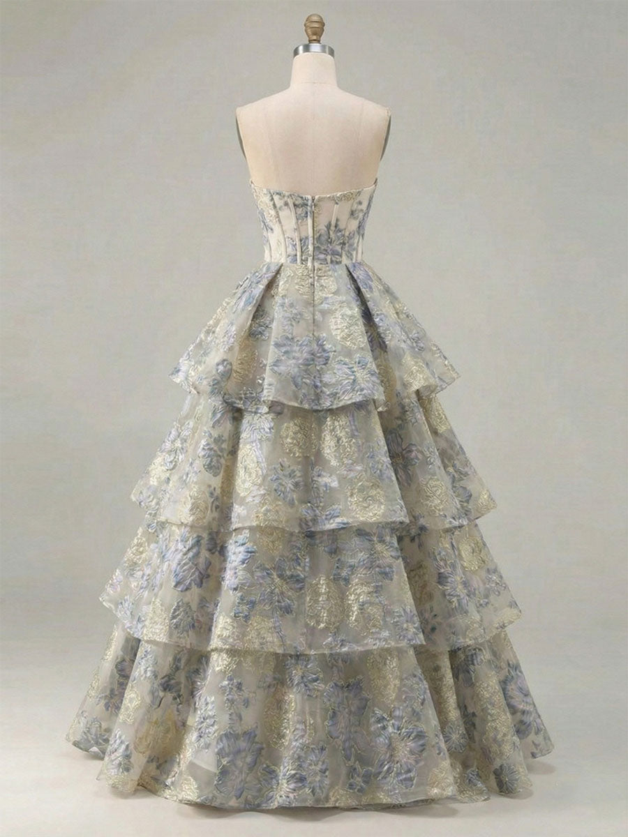 Dusty Blue Floral Brocade Strapless Tiered Long Prom Dress