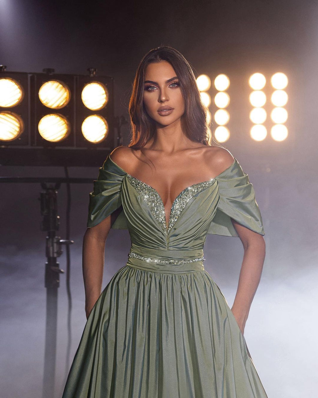 Elevate your style with our glamorous Long Dusty Sage A-line Off-the-shoulder Beading Sequined Prom Dress. This stunning dress will make you feel like a star with its elegant off-the-shoulder design and eye-catching beading and sequin details. Perfect for prom or any special occasion. you'll be the center of attention in this one-of-a-kind dress.