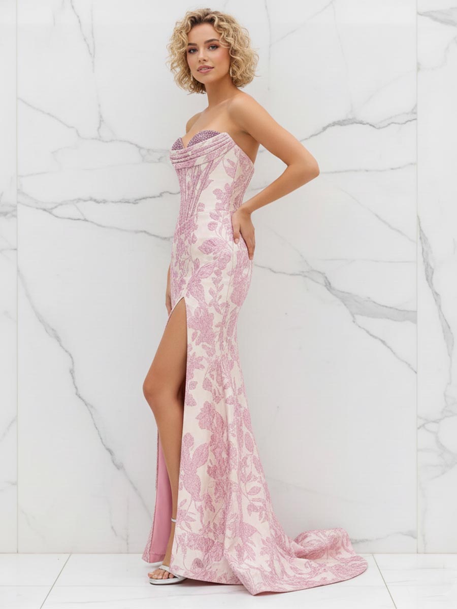 Glamorous Pink Floral Jacquard Corset Prom Dress with Beaded Bustier