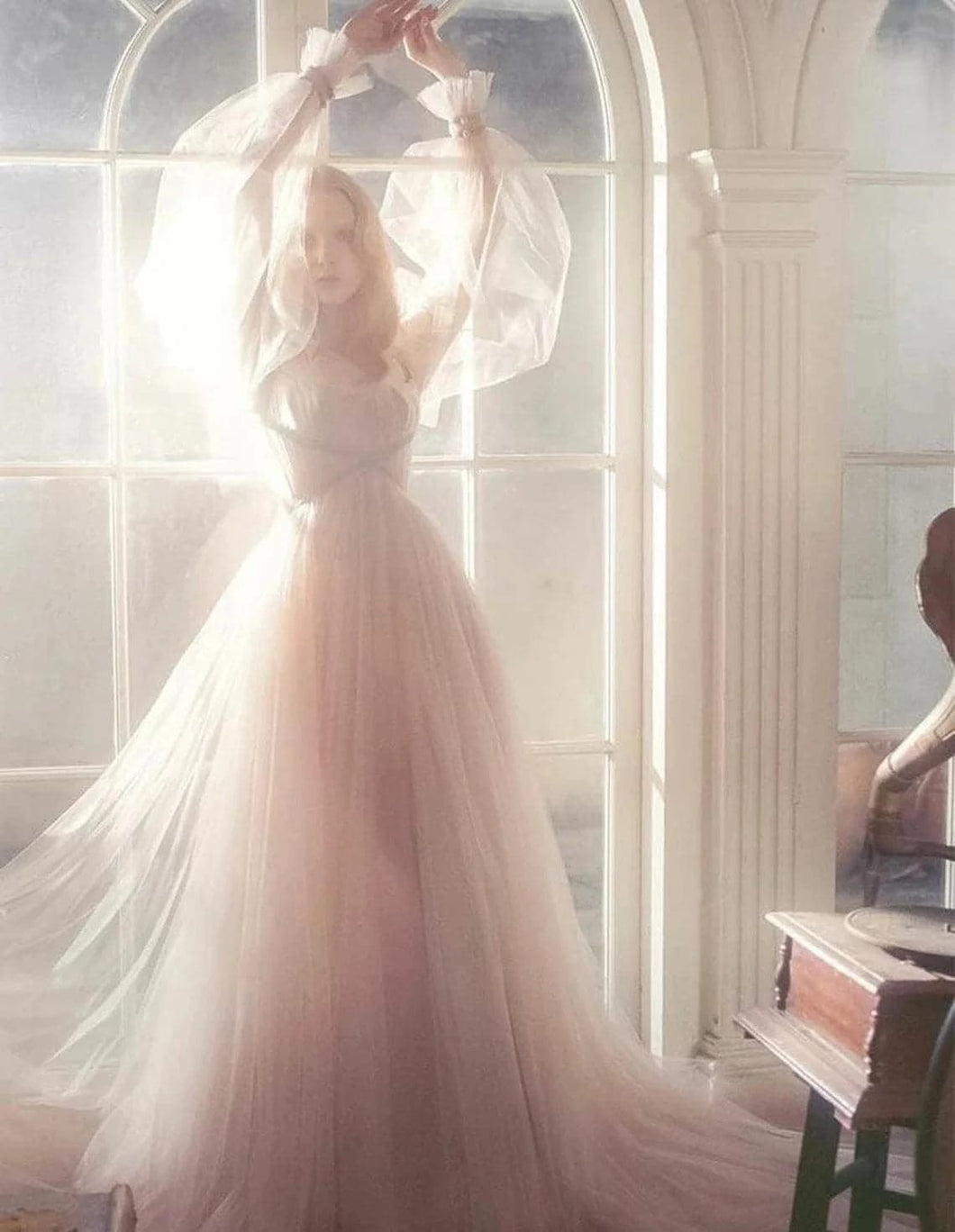 Occasion: Engagement. Birthday. Formal EveningStyle: Elegant. BohoSilhouette: A-LineHemline / Train: Sweep / Brush TrainNeckline: Scoop NeckFabric: TulleClosure: Zipper UPSleeve Length: Long SleeveEmbellishment: Pleats. RuchedBuilt-In Bra: YesBoning: YesTips: Professional dry cleaner only. Colors may vary slightly due to different monitor settings