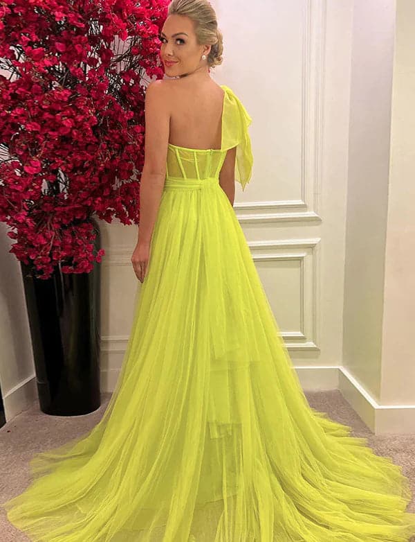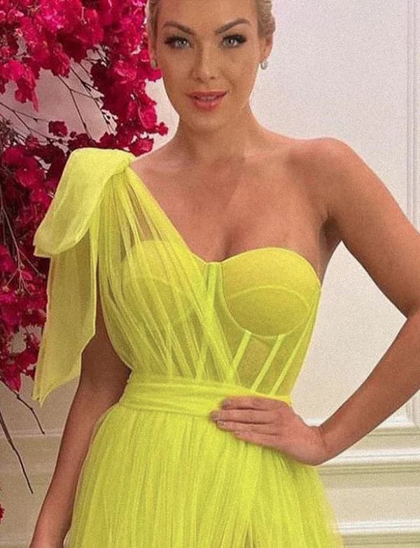 Experience elegance and allure with our Yellow Prom Dress. featuring a unique one-shoulder design and a sexy high slit. The flowing layered tulle skirt creates a luxurious look. while the long floor length provides a sophisticated silhouette. The no sleeve design adds to the modern style.