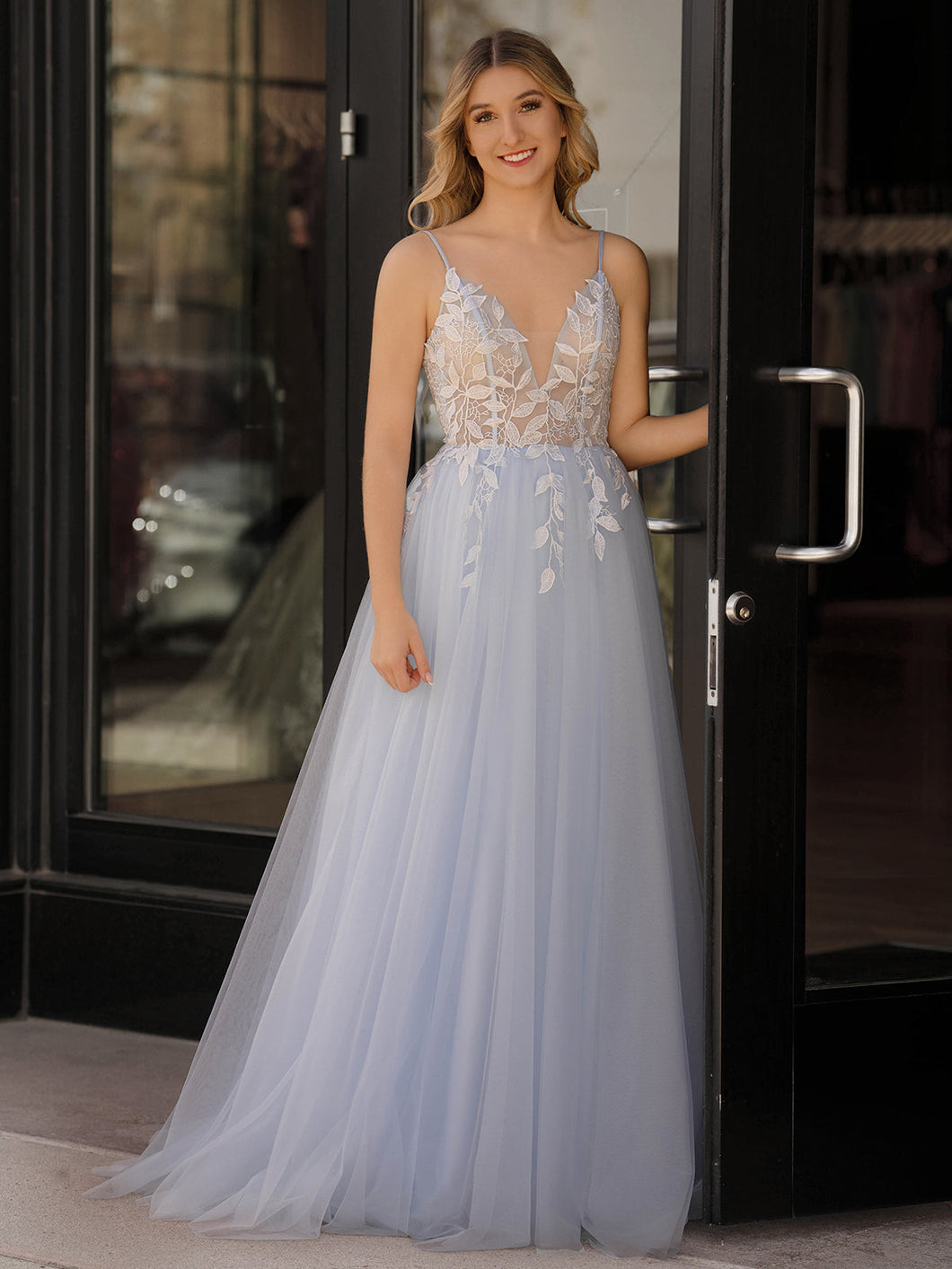 Meet Cynthia. an enchanting light blue A-line prom dress that embodies ethereal grace and elegance. Crafted from the softest tulle fabric. this gown floats effortlessly to a floor-length finish. complemented by a sweeping train for a touch of grandeur. An ideal choice for both evening dresses and formal dresses. with its romantic sweetheart neckline held by delicate spaghetti straps. creating a feminine and flattering shape. The sleeveless design adds a touch of sophistication. perfect for spring and summer prom nights. The back of the dress is adorned with a lace-up closure. ensuring a perfect fit while adding a vintage charm. Cynthia is intricately embellished with appliques and pleats. adding texture and depth to this dreamy creation.