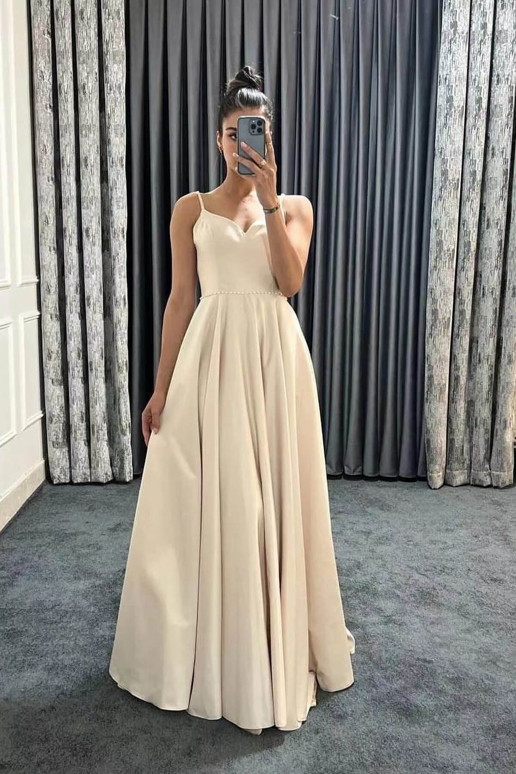 This long A-line prom dress features spaghetti straps. a V-neck. and a sleeveless design. Made to flatter any body type and provide all-night comfort. this dress is perfect for prom or any special occasion. The flowing silhouette and elegant details make it a must-have for a timeless and sophisticated look.