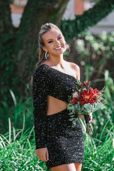 With a sleek one shoulder design and stylish long sleeves. the One Shoulder Purple Bodycon Homecoming Dress is designed to flatter and accentuate your figure. Not only will you make a statement at your special occasion. but you'll also be comfortable with its zipper back closure. Elevate your style with this stunning and elegant sequin hoco dress.
