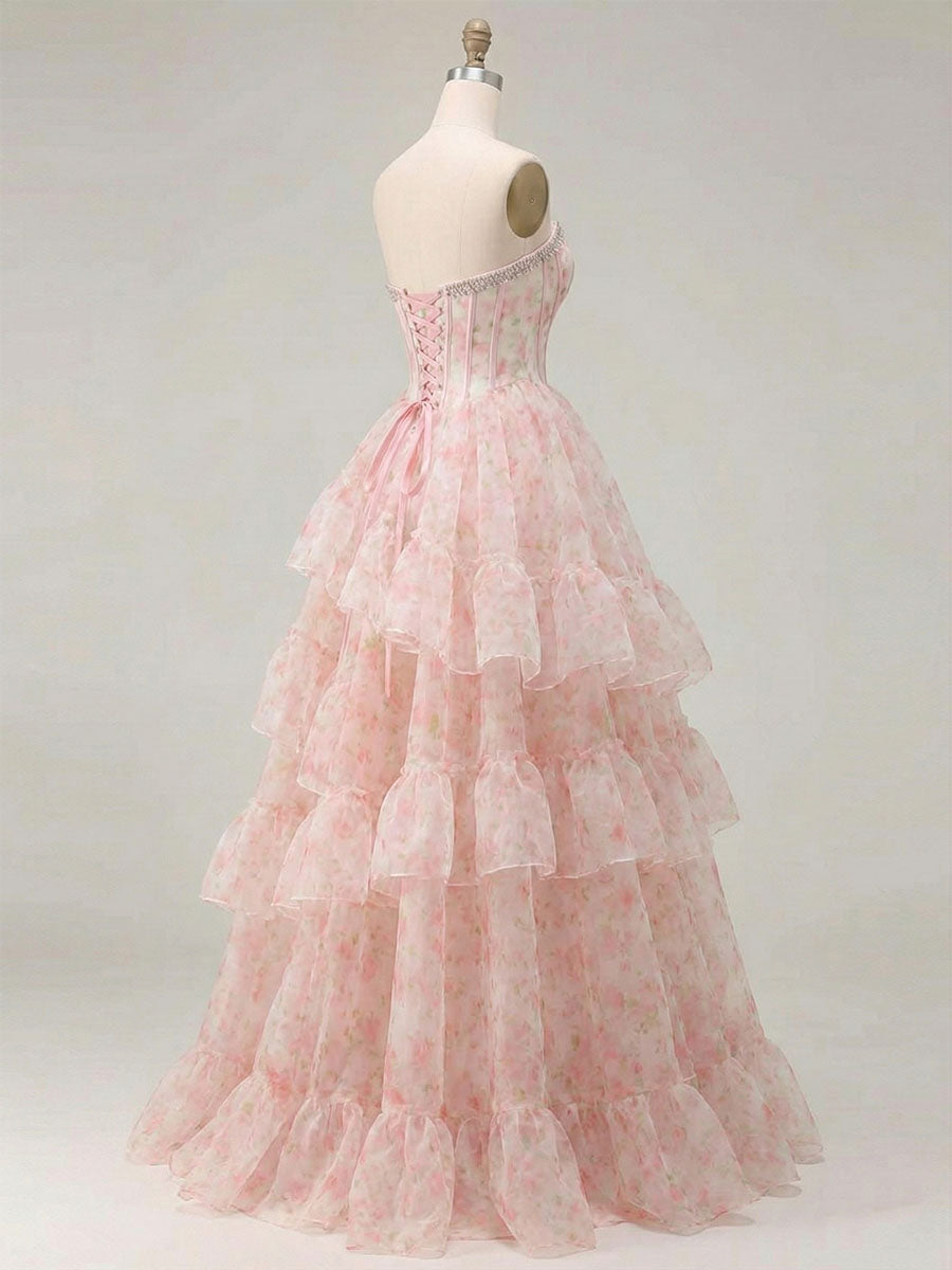 Pink Floral Print Organza Strapless Crystal Trimmed Corset Tiered Prom Dress