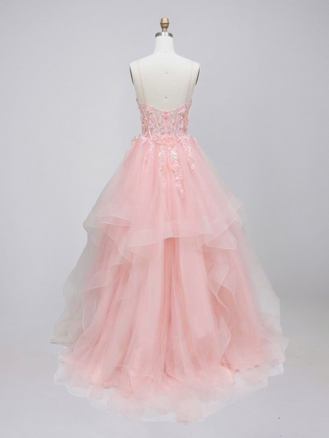 Pink Tiered Tulle Prom Dress with Floral Embroidered Sheer Corset