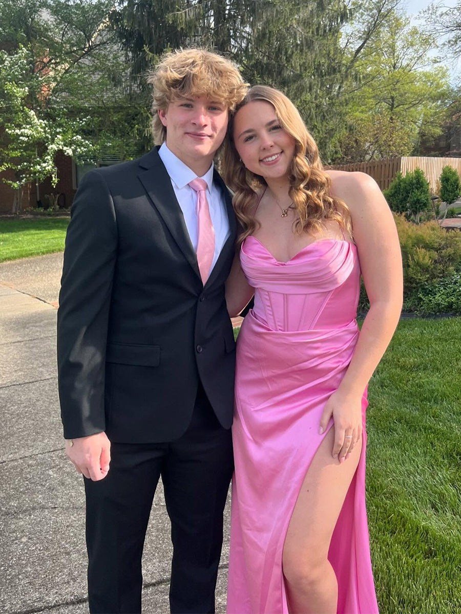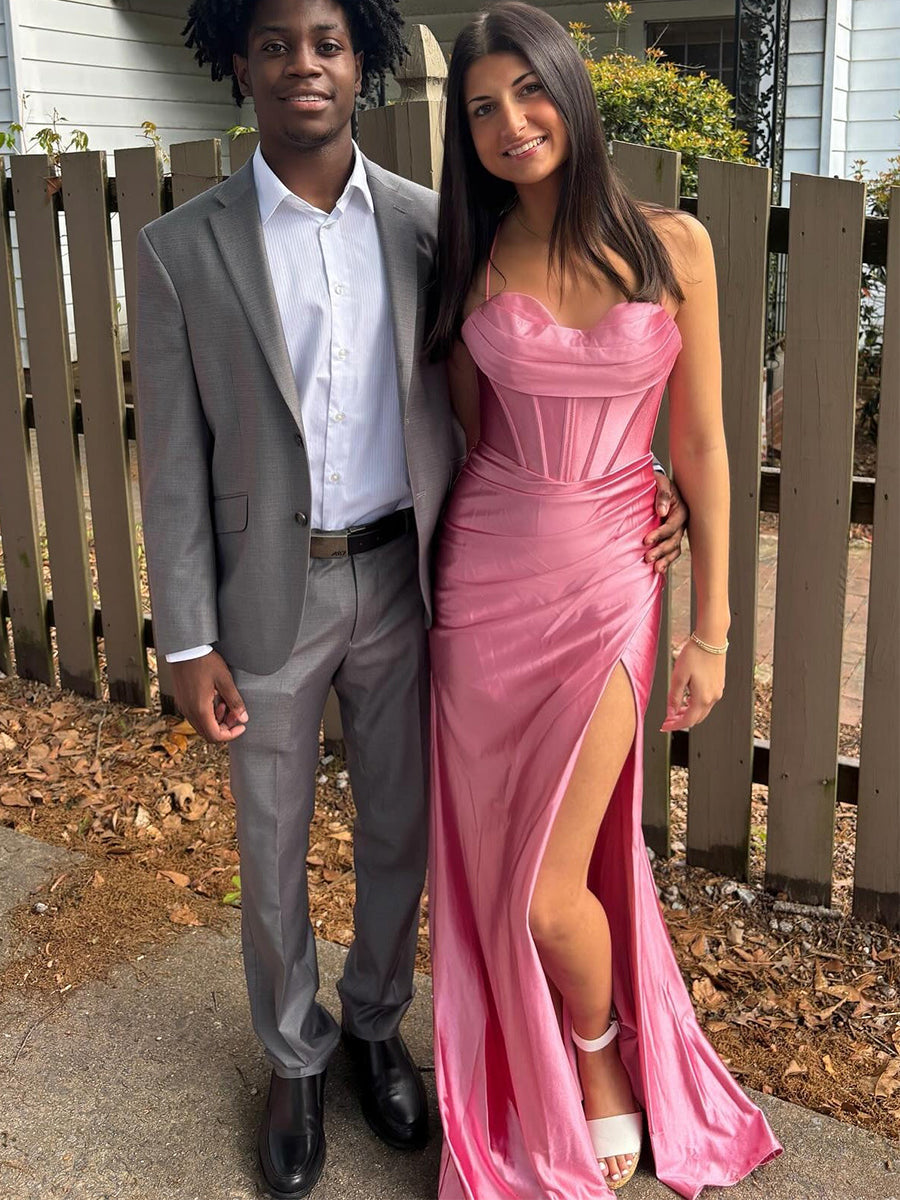 Make a stunning entrance in this electric royal blue prom gown. The design creates a perfect balance of soft romance and structured glamour. The bodice features a chic strapless cowl neckline that drapes elegantly across the bust. sitting atop a fitted corset waist with visible vertical boning for a snatched. defined look. The skirt is crafted from lustrous satin that is artfully ruched at the hip. flowing into a sleek floor-length silhouette with a daring high thigh slit. This gown is a powerful choice for prom. military balls. or any formal event where you want to radiate confidence.