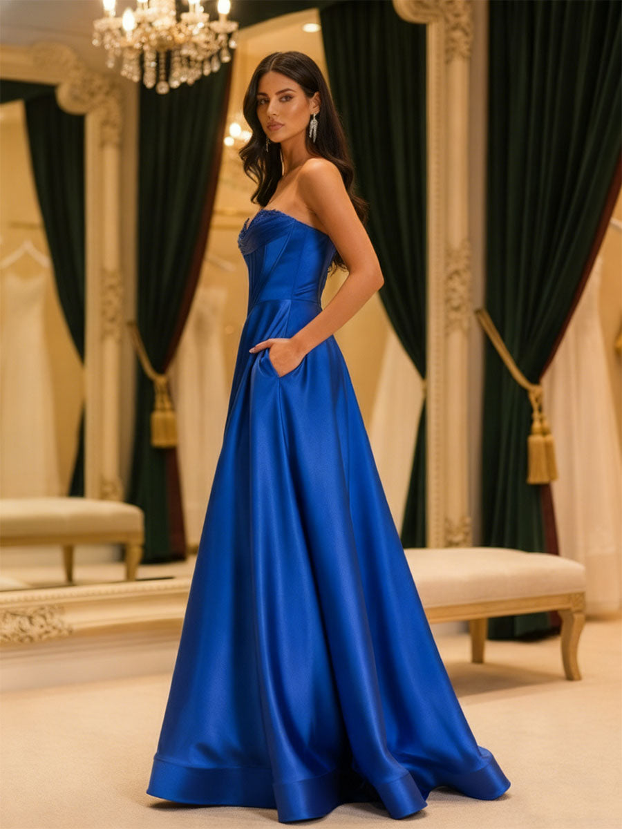 Command attention in this breathtaking royal blue prom gown. The dress features a structured strapless bodice with elegant visible corset boning. topped with a delicate sweetheart neckline and subtle scalloped lace trim. The waist is cinched before flowing into a magnificent. voluminous A-line skirt crafted from lustrous satin. Practicality meets glamour with hidden side pockets. perfect for keeping essentials close. A daring high thigh slit adds a modern. alluring touch to this classic silhouette. This gown is a showstopper for prom. military balls. or any grand formal event.